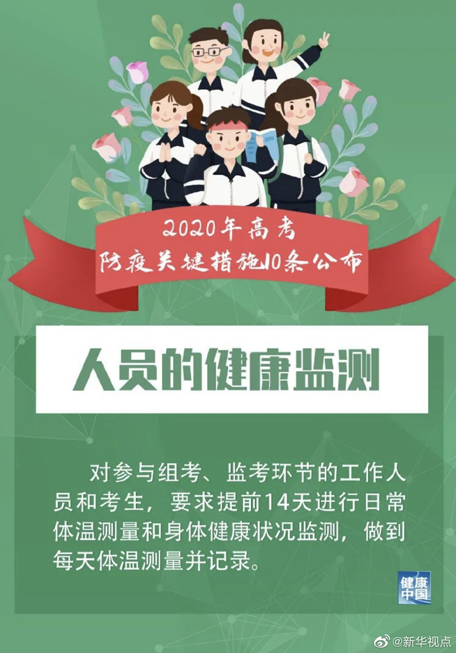 此外,措施提到,對參與組考、監考環節的工作人員和考生,要求提前14天進行日常體溫測量和身體健康狀況監測,做到每天體溫測量并記錄。