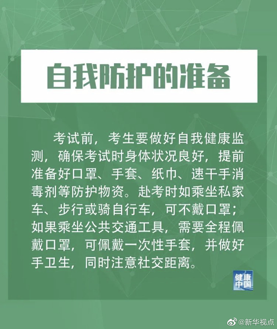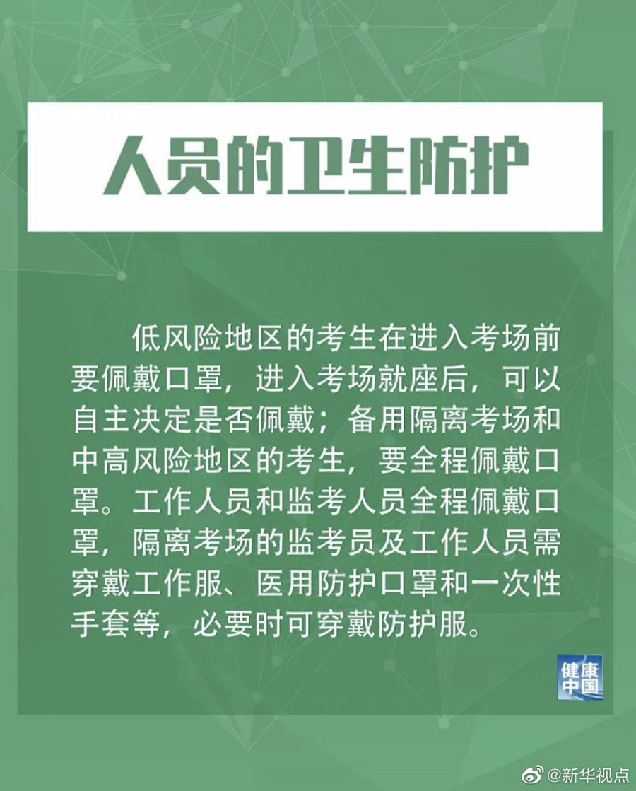 措施提到,低風險地區的考生在進入考場前要佩戴口罩,進入考場就座后,可以自主決定是否佩戴;備用隔離考場和中高風險地區的考生,要全程佩戴口罩。工作人員和監考人員全程佩戴口罩,隔離考場的監考員及工作人員須穿戴工作服、醫用防護口罩和一次性手套等,必要時可穿戴防護服。