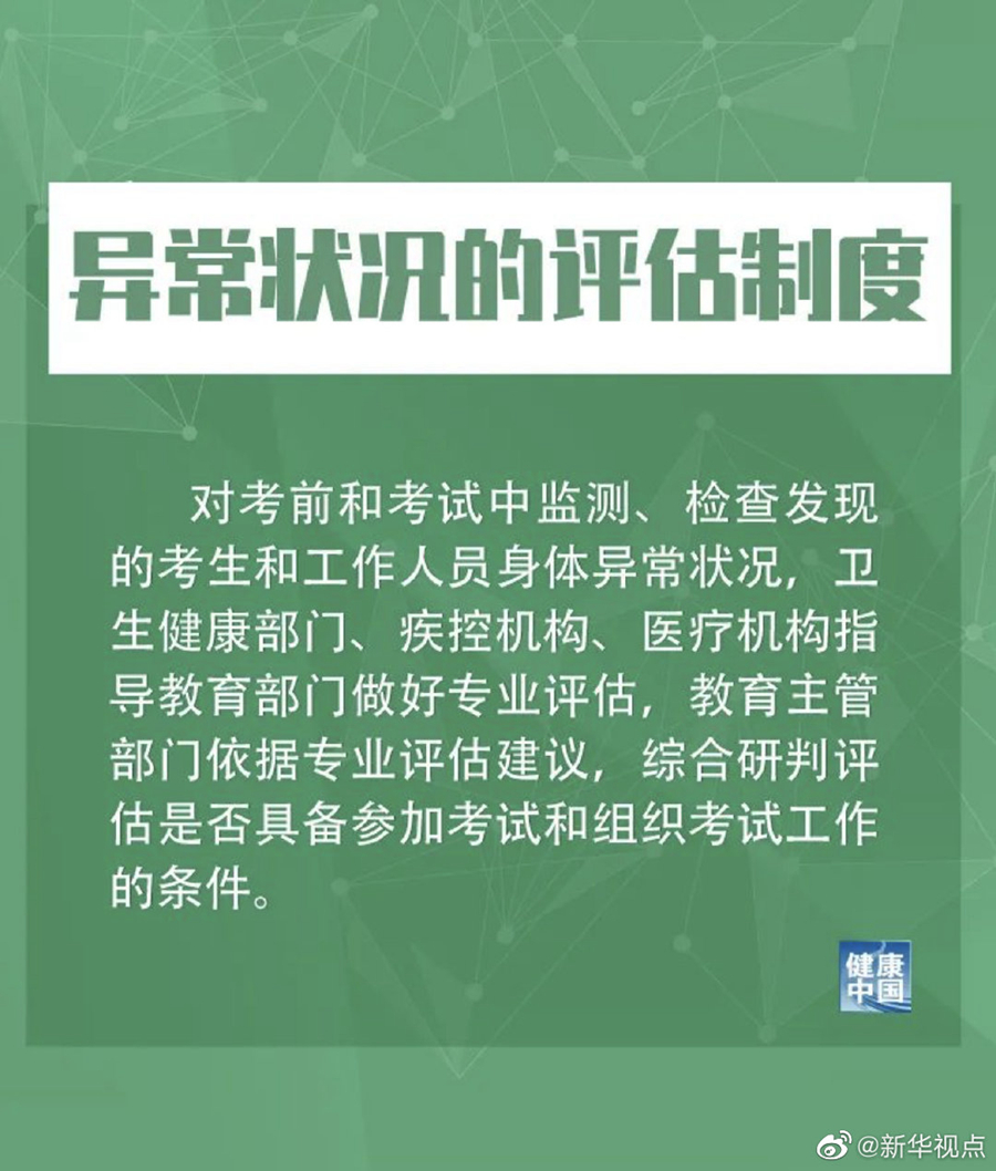 考試過程中有發熱、咳嗽等呼吸道癥狀者,措施提到,由考點當地的衛生健康部門、疾控機構和醫療機構專業人員進行個案研判,具備繼續完成考試條件的考生,須安排在備用隔離考場考試。考生從普通考場轉移至備用隔離考場(未出考點)所耽誤的時間,經省級招生考試機構批準予以補齊。當科目考試結束時,由負責研判的專業人員當場簡要向所有考生進行解釋和說明,避免其他考生恐慌。
