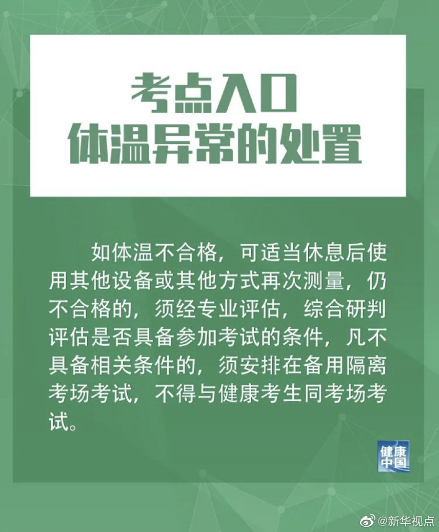 新華社北京6月25日電(記者王琳琳)國家衛健委官網日前發布10條2020年高考防疫關鍵措施。其中提到,所有考生、考試工作人員體溫低于37.3℃方可進入考點。如體溫不合格,可適當休息后使用其他設備或其他方式再次測量,仍不合格的,須經專業評估,綜合研判評估是否具備參加考試的條件,凡不具備相關條件的,須安排在備用隔離考場考試,不得與健康考生同考場考試。