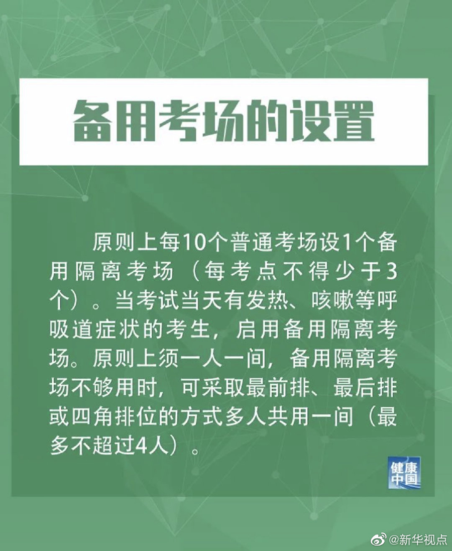 對于備用考場的設置,措施提到,原則上每10個普通考場設1個備用隔離考場(每考點不得少于3個)。當考試當天有發熱、咳嗽等呼吸道癥狀的考生,啟用備用隔離考場。原則上須一人一間,備用隔離考場不夠用時,可采取最前排、最后排或四角排位的方式多人共用一間(最多不超過4人)。
