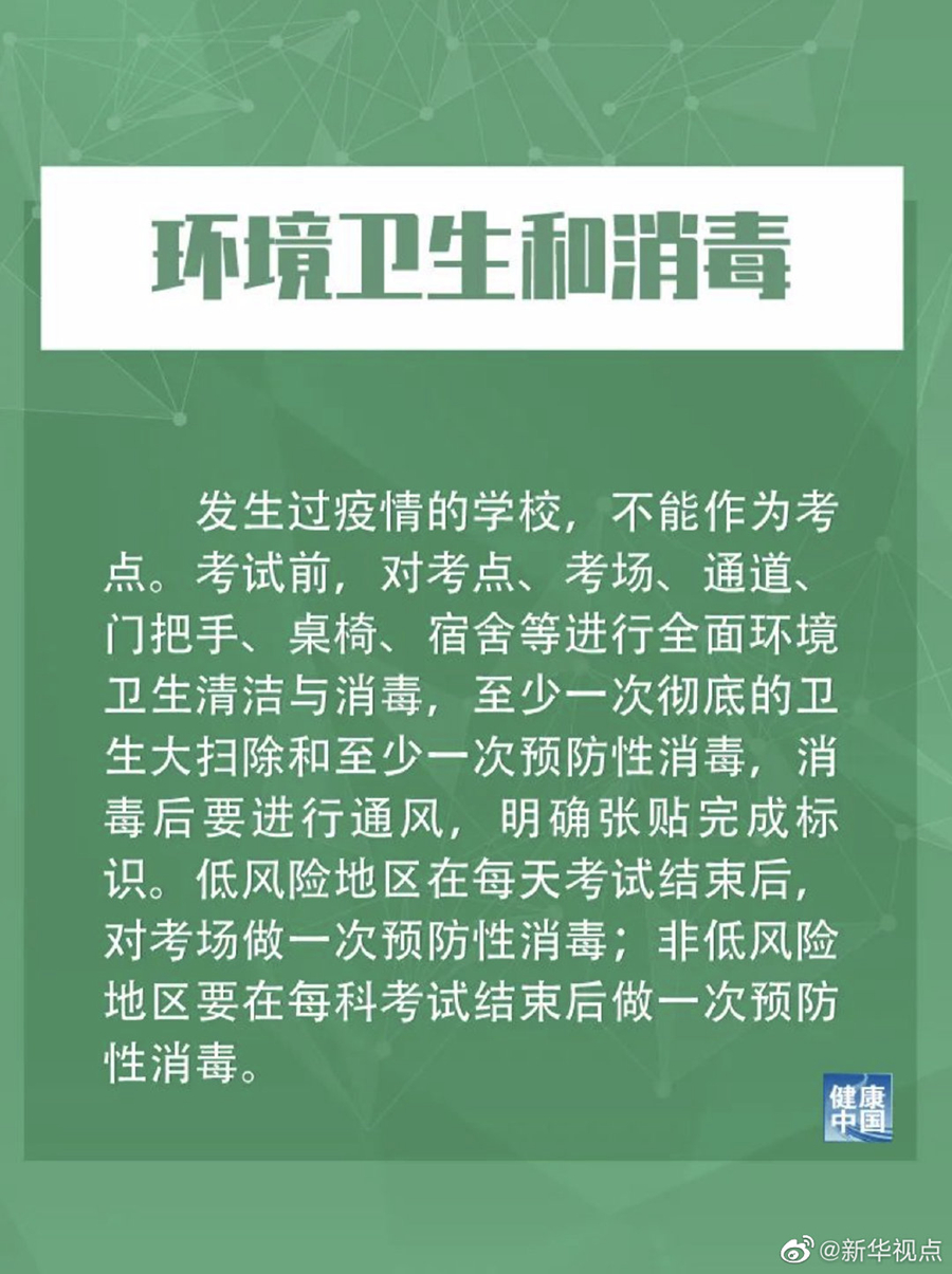 措施提到,發生過疫情的學校,不能作為考點。低風險地區在每天考試結束后,對考場做一次預防性消毒;非低風險地區要在每科考試結束后做一次預防性消毒。