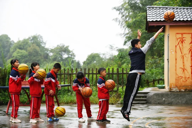 貴州一特崗教師與學生在體育課上練習投籃 楊文斌 攝