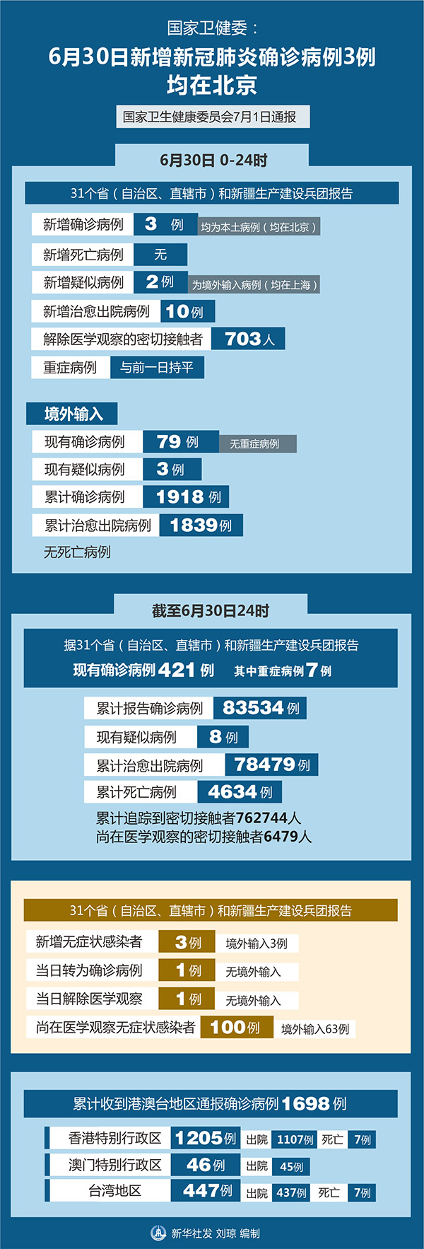 截至6月30日24時,據31個省(自治區、直轄市)和新疆生產建設兵團報告,現有確診病例421例(其中重癥病例7例),累計治愈出院病例78479例,累計死亡病例4634例,累計報告確診病例83534例,現有疑似病例8例。累計追蹤到密切接觸者762744人,尚在醫學觀察的密切接觸者6479人。