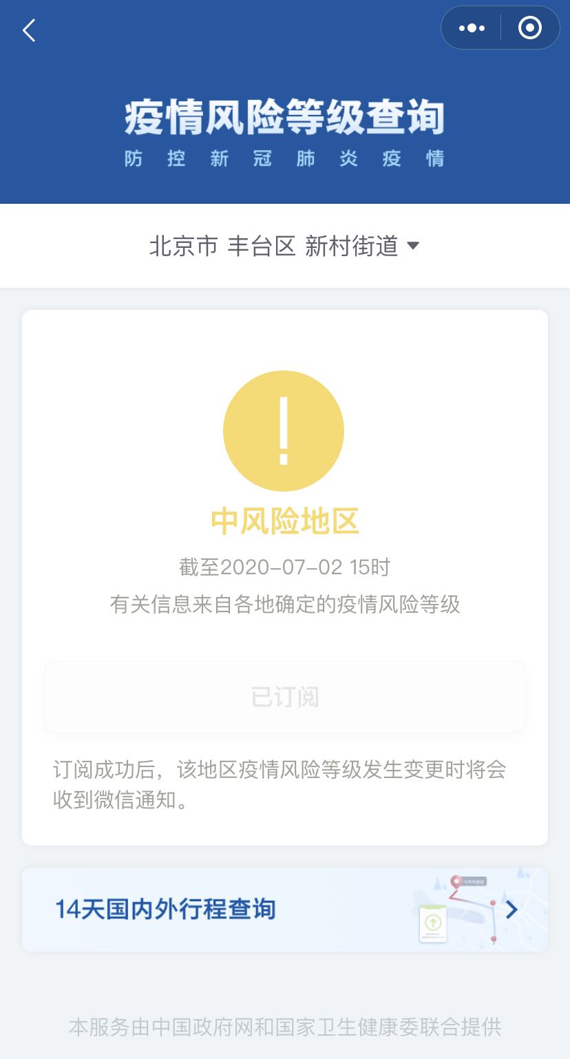 記者從國務(wù)院客戶端小程序“疫情風(fēng)險(xiǎn)等級查詢”了解到,截至7月2日15時,北京市豐臺區(qū)新村街道由高風(fēng)險(xiǎn)地區(qū)降級為中風(fēng)險(xiǎn)地區(qū)。