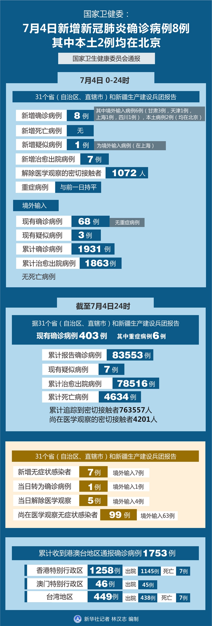 截至7月4日24時,據31個?。ㄗ灾螀^、直轄市)和新疆生產建設兵團報告,現有確診病例403例(其中重癥病例6例),累計治愈出院病例78516例,累計死亡病例4634例,累計報告確診病例83553例,現有疑似病例7例。累計追蹤到密切接觸者763557人,尚在醫學觀察的密切接觸者4201人。