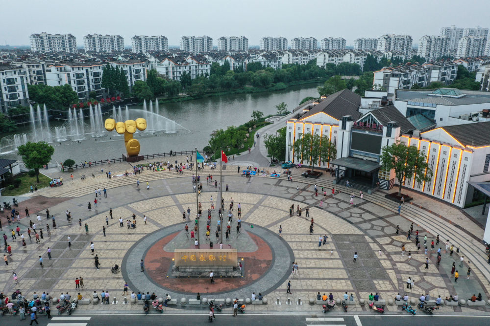 6月19日,居民在江蘇張家港永聯(lián)村的廣場(chǎng)跳舞(無(wú)人機(jī)照片)。新華社記者 楊磊 攝