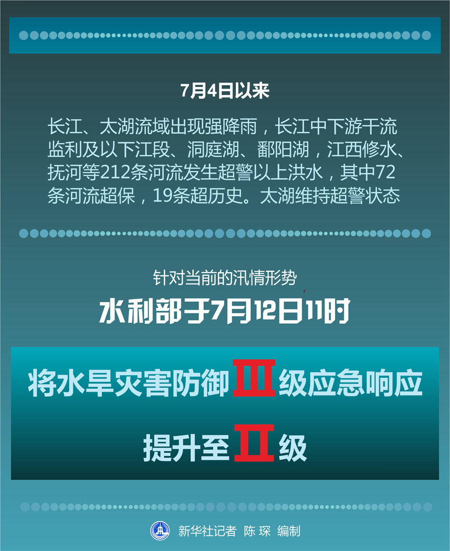 新華社北京7月12日電(記者胡璐)7月4日以來,長江、太湖流域出現強降雨,長江中下游干流監利及以下江段、洞庭湖、鄱陽湖,江西修水、撫河等212條河流發生超警以上洪水,其中72條河流超保,19條超歷史。太湖維持超警狀態。針對當前的汛情形勢,水利部于12日11時將水旱災害防御Ⅲ級應急響應提升至Ⅱ級。