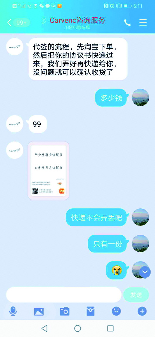 淘寶網上有多家能代簽三方協議的商家。在看到記者“能否代蓋三方協議公章”的留言后,一家名為“carvenc education”的商家立即追問所在學校、專業。記者提供相關信息后,不到一分鐘,商家就發來相匹配的公司名稱和崗位,“只要99元,協議書真實有效,包回訪?!?/p>
