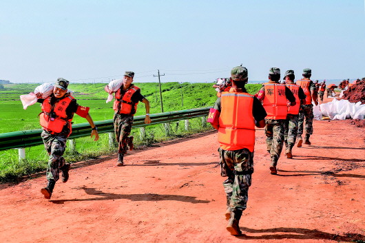 7月13日,江西鄱陽縣珠湖聯圩出現多處管涌,第72集團軍某旅出動200余名官兵趕赴現場封堵管涌。新華社發(張毛攝)