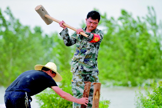 7月12日,江洲鎮柳州村的村支書洪棉雪(右)和村民一起打樁,加固堤壩。新華社記者彭昭之攝
