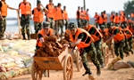 7月13日,在安徽省望江縣雷池鄉同馬大堤上,武警官兵在搬運防洪沙袋。新華社發(韓華東攝)