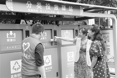 浙江推行“減桶并點”,優化垃圾分類。圖為吳興區環渚街道某小區,志愿者向居民宣傳即將投放的分類投放驛站。新華社記者 翁忻旸攝