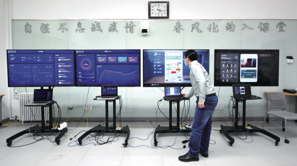 2月17日,工作人員在管理維護清華大學(xué)在線教學(xué)平臺 “雨課堂”(鞠煥宗/攝)