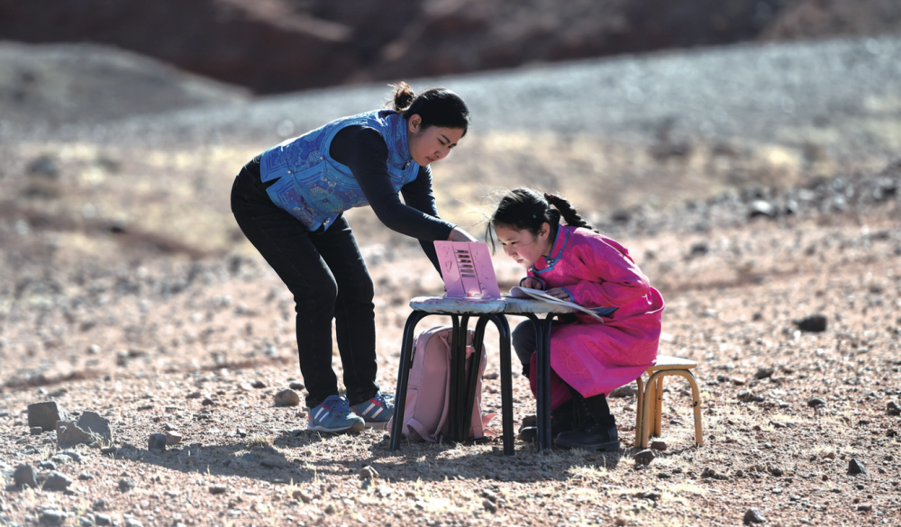 4月1日,內(nèi)蒙古自治區(qū)阿拉善左旗蒙古族學(xué)校四年級學(xué)生策耿(右)在家附近的戈壁上上網(wǎng)課(劉磊/攝)