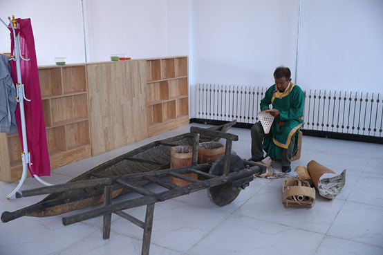 在獵民村手工藝工坊記者見到年輕時(shí)打過(guò)獵、扎過(guò)撮羅子(狩獵和游牧民族的一種圓錐形“房子”)的那春林,他正在用樺樹皮制作蟈蟈籠子。鄂溫克人會(huì)在籠子里放上蟈蟈,把蟈蟈當(dāng)作魚餌帶到阿倫河釣細(xì)鱗魚。他身旁的樺樹皮船、儲(chǔ)物筒、刀具配件都是用樺樹皮制作的。那春林說(shuō)今年已接到一批展品訂單,預(yù)計(jì)可以收入4萬(wàn)塊錢,家里流轉(zhuǎn)的土地還可以為他帶來(lái)3萬(wàn)多元收入。