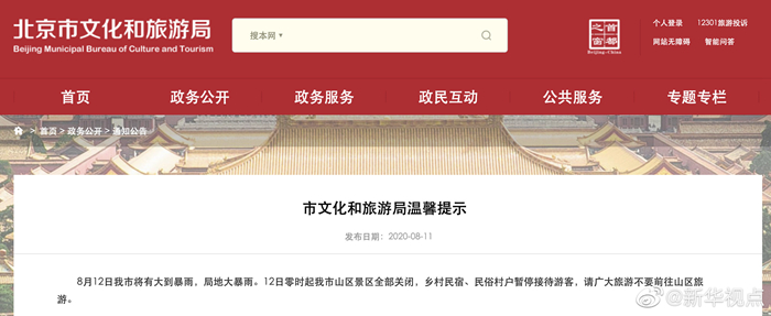 北京市文旅局11日晚間發布提示稱,8月12日北京將有大到暴雨,局地大暴雨,12日零時起本市山區景區全部關閉,鄉村民宿、民俗村戶暫停接待游客,廣大游客不要前往山區旅游。(記者張漫子) ?????