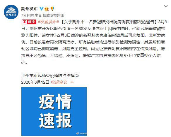 據湖北省荊州市新冠肺炎疫情防控指揮部12日通報,8月9日,荊州市開發區聯合街道一名68歲女退休職工因病住院時,經新冠病毒核酸檢測為陽性,該女性為2月8日確診的新冠肺炎患者治愈數月后再次復陽,非新發病例。目前該患者再次隔離治療,所有接觸者均進行核酸檢測為陰性,其居所和活動區域均已徹底消毒,風險完全控制。尚無證據表明復陽病例存在傳播風險,請市民不必恐慌、不信謠、不傳謠。提醒廣大市民常態化形勢下也要重視個人防護。