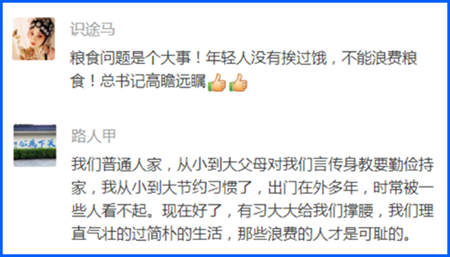 吃飯人人會,但怎么吃卻見境界。早在2013年,總書記在闡述糧食安全戰略時就告誡人們,“要牢記歷史,在吃飯問題上不能得健忘癥,不能好了傷疤忘了疼”。這次,總書記又強調,“盡管我國糧食生產連年豐收,對糧食安全還是始終要有危機意識”。對此,很多網友深表贊同,認為這些指示要言不煩、直指要害,我們決不能忘記餓肚子的歲月!