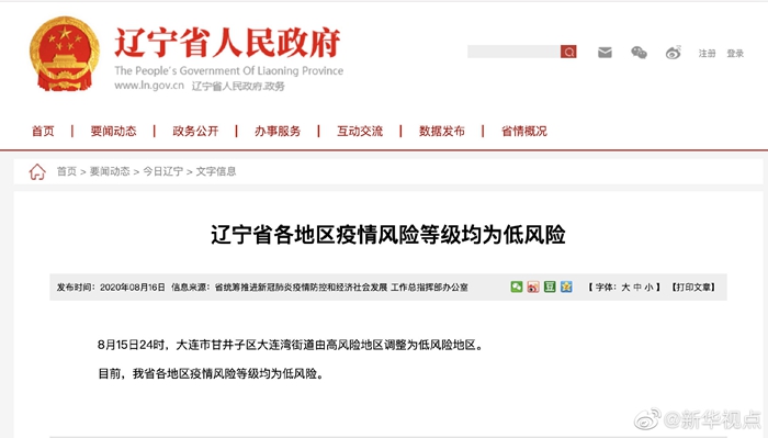 8月15日24時,大連市甘井子區大連灣街道由高風險地區調整為低風險地區。目前,遼寧省各地區疫情風險等級均為低風險。?