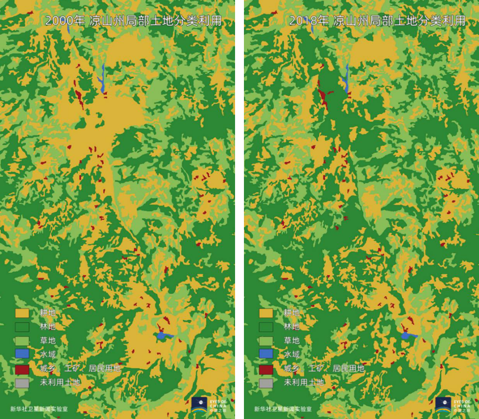 累計退耕還林超過243.8萬畝,衛星觀察到涼山植被的變化,反映出水土流失被控制、減緩以及扭轉的全過程,糧食年產量實現高達50%的增長。