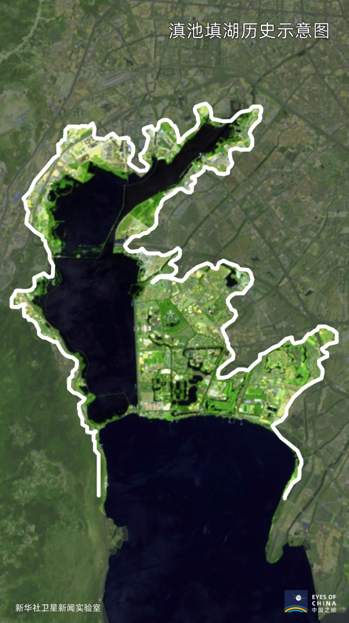 ↑滇池北部填湖示意圖,白線內土地為上世紀60年代后填湖所得。