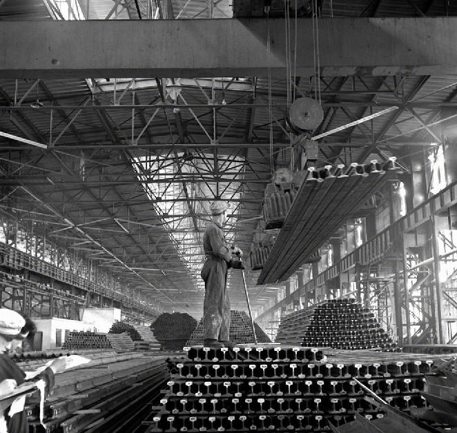 ?“一五”期間,鞍鋼興建的第一座大型軋鋼廠生產能力已迅速超過設計標準。這是這個廠生產的大批鋼軌(攝于1957年4月)。 ?