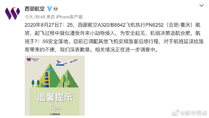 西部航空一合肥起飛客機疑遭小動物侵入 返航乘客已另搭機抵達重慶-新華網