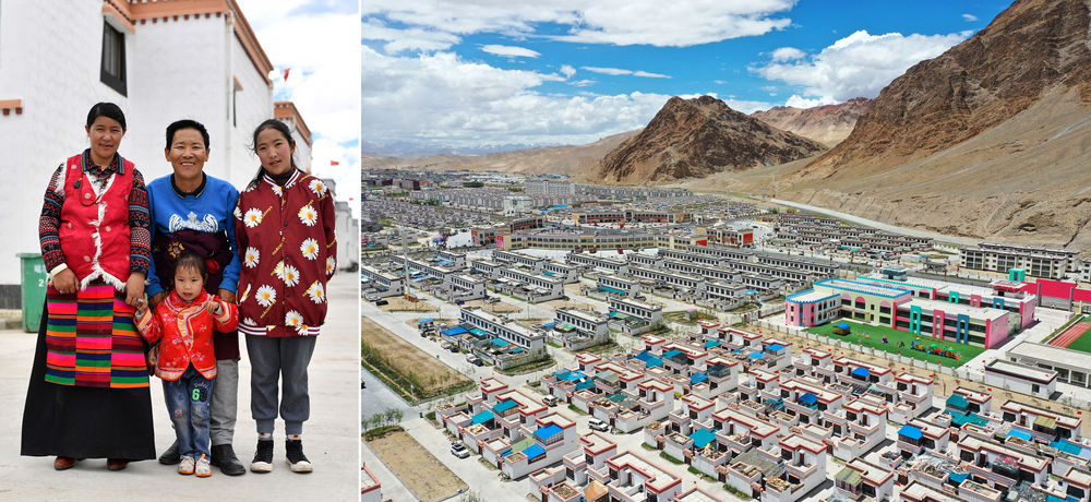 拼版照片:左圖為西藏阿里地區日土縣東汝鄉阿汝村村民丹木真一家在噶爾縣康樂新居易地扶貧搬遷安置點;右圖為該搬遷安置點一角(無人機照片)。新華社記者 詹彥 攝