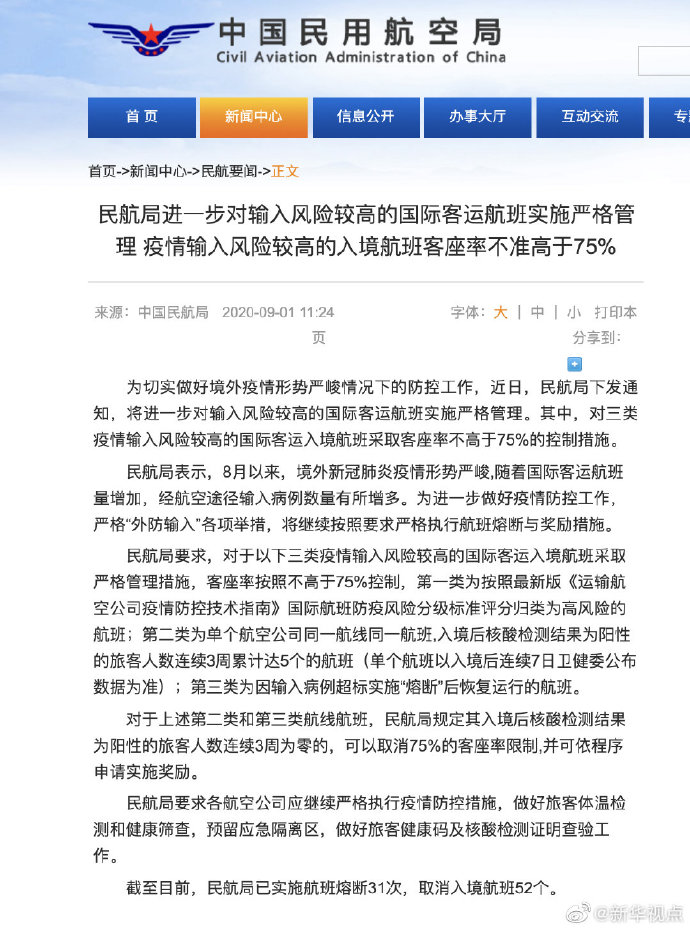 民航局:疫情輸入風(fēng)險(xiǎn)較高的入境航班客座率不準(zhǔn)高于75%-新華網(wǎng)