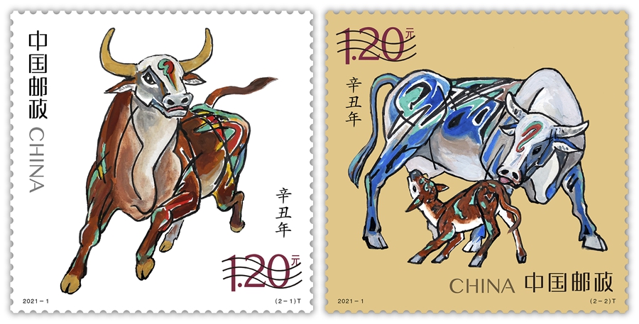 《辛丑年》特種郵票由著名畫家姚鐘華先生創作,延續了第四輪生肖郵票的“家國”理念。第一枚名為“奮發圖強”,描繪了雄壯有力、一往無前的奔牛形象。公牛四蹄揚起,昂首向前,目光炯炯,表達出不畏艱險、砥礪前行,為實現中華民族偉大復興而努力奮斗的寓意。第二枚名為“牛年大吉”,通過大牛與小牛舐犢情深的溫馨畫面,向全國人民傳遞家庭興旺和諧、團圓美滿的美好祝愿。