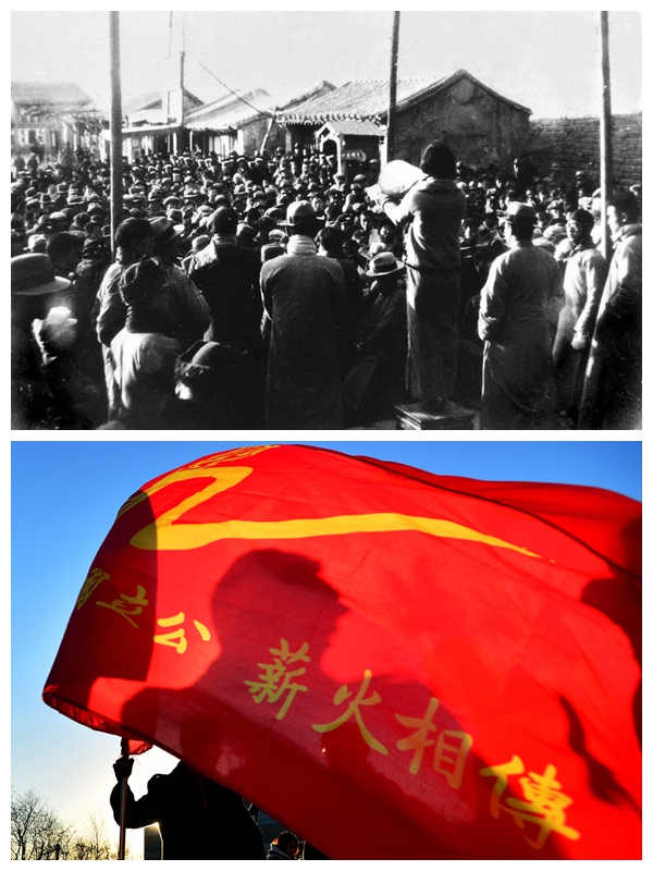 上圖為1935年12月9日,“一二·九”運動在北平爆發。這是被軍警擋在西直門外的大中學學生就地發表抗日演講。