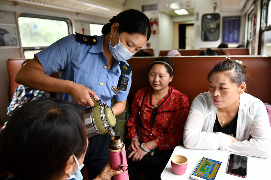 列車上沒有鍋爐間,飲用熱水需要乘務(wù)人員從漢中、陽平關(guān)車站進(jìn)行補(bǔ)給。圖為乘務(wù)員為旅客添開水。(8月22日攝)