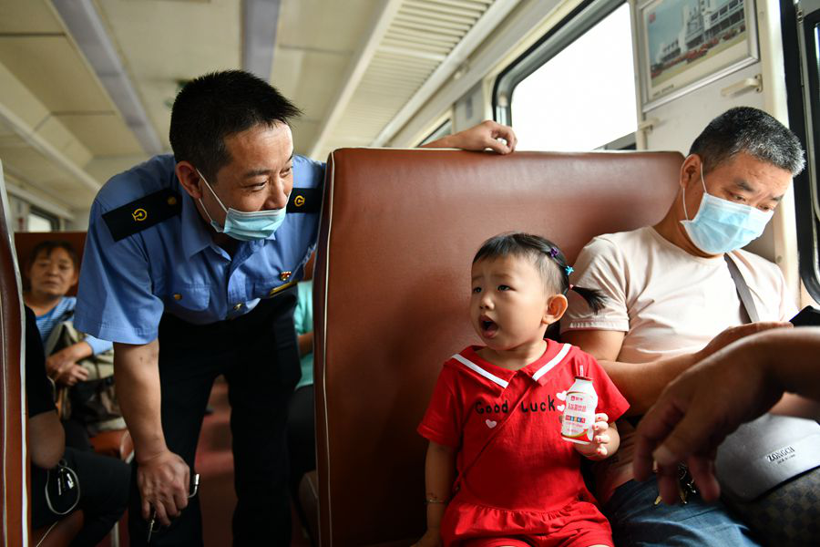 8月22日,在從陽平關(guān)返回漢中的8362次列車上,列車長修寶成與小旅客交流。?