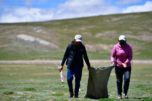 在青海省果洛藏族自治州瑪多縣瑪查理鎮噶丹村,生態管護員索南吉(右)與才讓多杰在村子周邊的草原上撿垃圾(8月19日攝)。新華社記者 張龍 攝