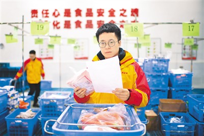 陜西黃馬甲物流配送股份有限公司生鮮中央工廠的工作人員認真核對供應鏈產品。馬 壯攝