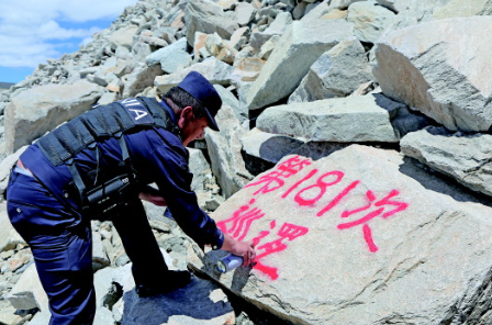索朗達杰在崗布冰川巡邏時,在石塊上標記巡邏次數。 本報記者劉小草攝