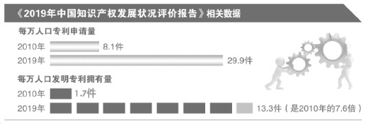 近日,國家知識產權局知識產權發展研究中心發布《2019年中國知識產權發展狀況評價報告》(以下簡稱《報告》)。《報告》顯示,從2010年到2019年,每萬人口專利申請量由8.1件增加到29.9件,每萬人口發明專利擁有量在2019年達到13.3件,是2010年的7.6倍;每萬人口商標申請量由7.0件增加到53.3件;每萬人口著作權登記量由3.4件提高到30件。