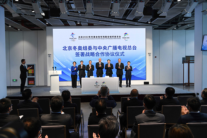 中央廣播電視總臺編務會議成員薛繼軍與北京冬奧組委專職副主席兼秘書長韓子榮簽署合作協議。薛繼軍在致辭中表示,北京冬奧會是展現國家形象、促進國家發展、振奮民族精神的重要契機,中央廣播電視總臺對奧運有著特殊的情懷,與北京有著親密的聯系,12年前北京夏季奧運會就曾展開緊密合作。當冬奧會再次來到北京,總臺已經擁有國內最具影響力的體育傳播平臺和經驗最豐富的賽事轉播制作團隊,具備多項國際國內大賽主轉播經驗、頂級體育傳播能力和全媒體傳播理念。