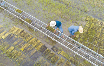 江蘇金湖縣金源農機合作社,社員用流水線運送水稻秧苗。賀敬華攝(人民視覺)