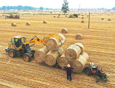 河南正陽縣李樓村,秸稈正打捆裝車。高萬寶攝(人民視覺)