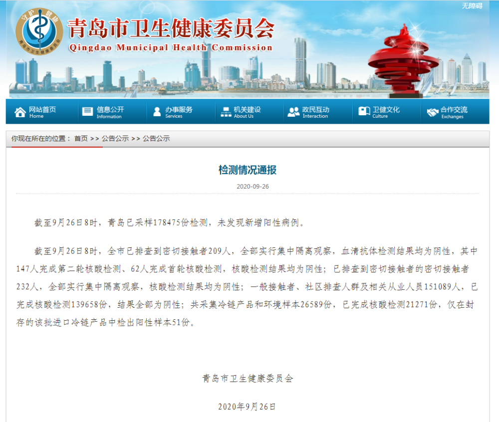 截至9月26日8時,青島已采樣178475份檢測,未發現新增陽性病例。