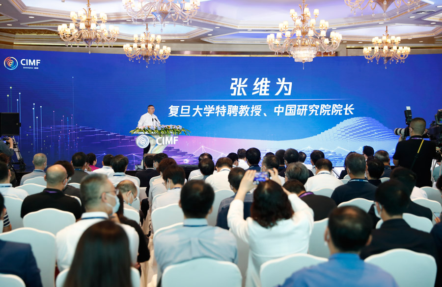 ??? 9月27日,2020中國網絡媒體論壇內容論壇在上海舉行,各界嘉賓圍繞“后疫情時代網絡傳播的‘變’與‘新’”這一主題開展探討和交流。圖為復旦大學中國研究院院長、特聘教授張維為作主題演講。