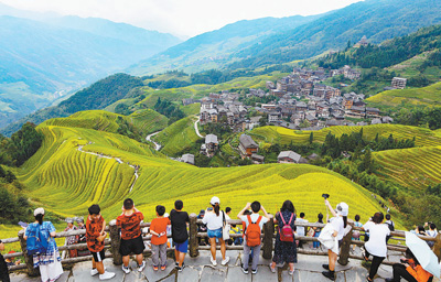 觀賞梯田秋色,體驗民俗風情,廣西桂林市龍勝各族自治縣龍脊梯田景區旅游持續火爆。圖為10月3日,游客在景區觀光游覽。吳生斌攝(影像中國)