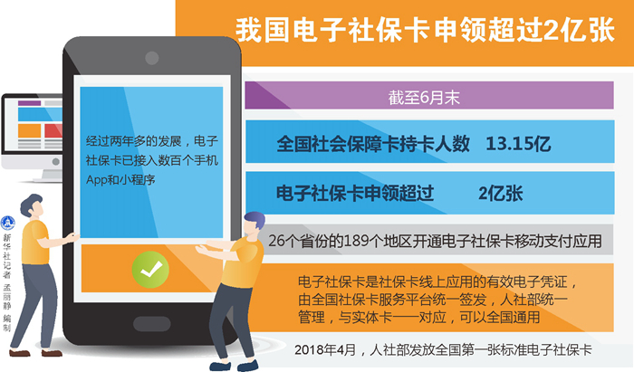 新華社北京10月6日電(記者姜琳)人力資源和社會保障部近日發布的數據顯示,截至6月末,全國社會保障卡持卡人數13.15億,電子社保卡申領超過2億張,26個省份的189個地區開通電子社保卡移動支付應用。