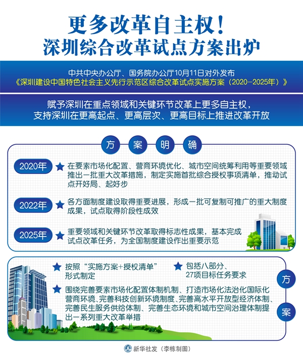 新華社北京10月11日電(記者安蓓、葉前)中共中央辦公廳、國務院辦公廳11日對外發布《深圳建設中國特色社會主義先行示范區綜合改革試點實施方案(2020-2025年)》,賦予深圳在重點領域和關鍵環節改革上更多自主權,支持深圳在更高起點、更高層次、更高目標上推進改革開放。