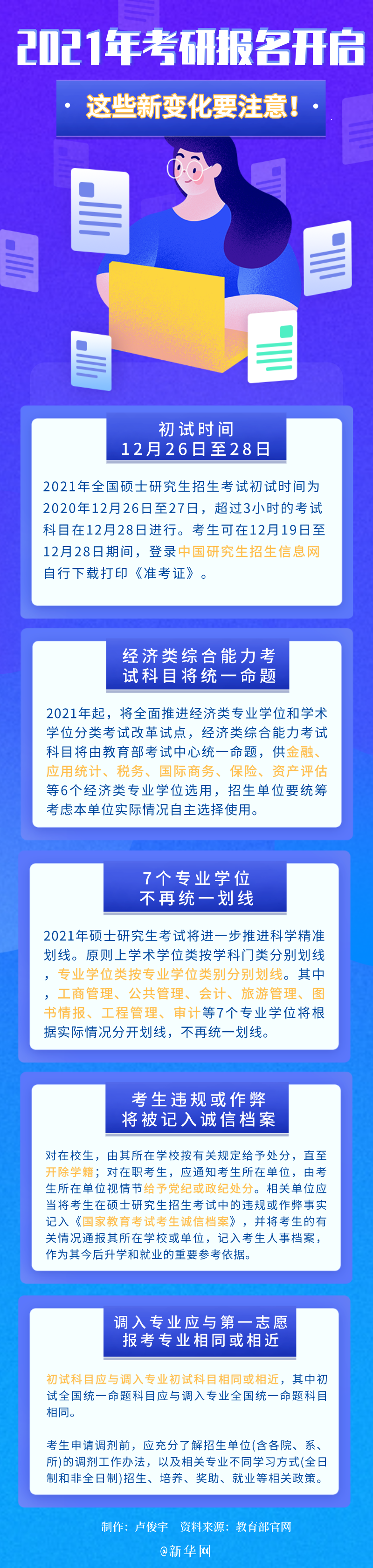 ??? 10月10日起至10月31日,全國碩士研究生招生考試開始正式報名,每天9:00-22:00,考生可登錄網上報名平臺填報報名信息。2021年研究生招生考試在考試命題、調劑、專業劃線等方面都有所調整,一圖帶你速覽這些方面的變化。
