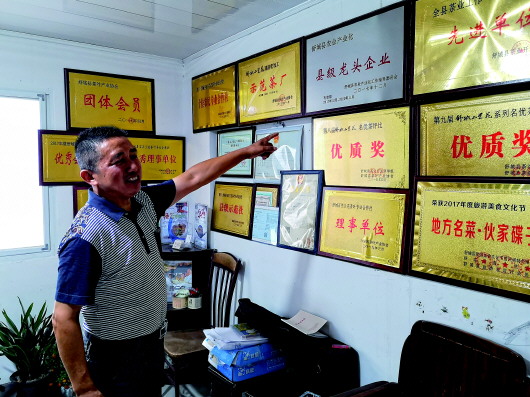 舒城縣五顯鎮(zhèn)石關蘭花茶葉專業(yè)合作社負責人龔世存向記者展示合作社獲得的榮譽(8月29日攝)。