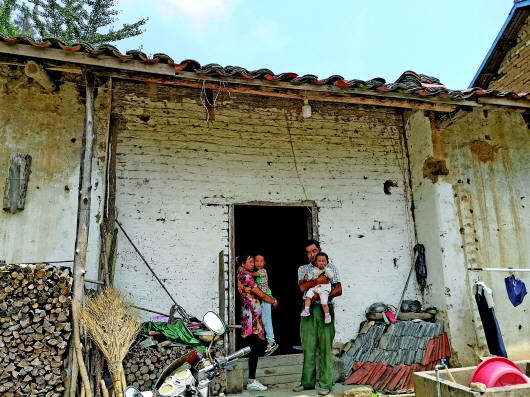 蘇平村珓子石組茶農余本高一家四口站在老房子門前(8月29日攝)。