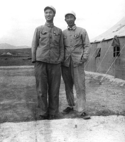 1951年夏新華社記者閻吾(右)、李耐因在開城停戰談判會場帳篷外留影。